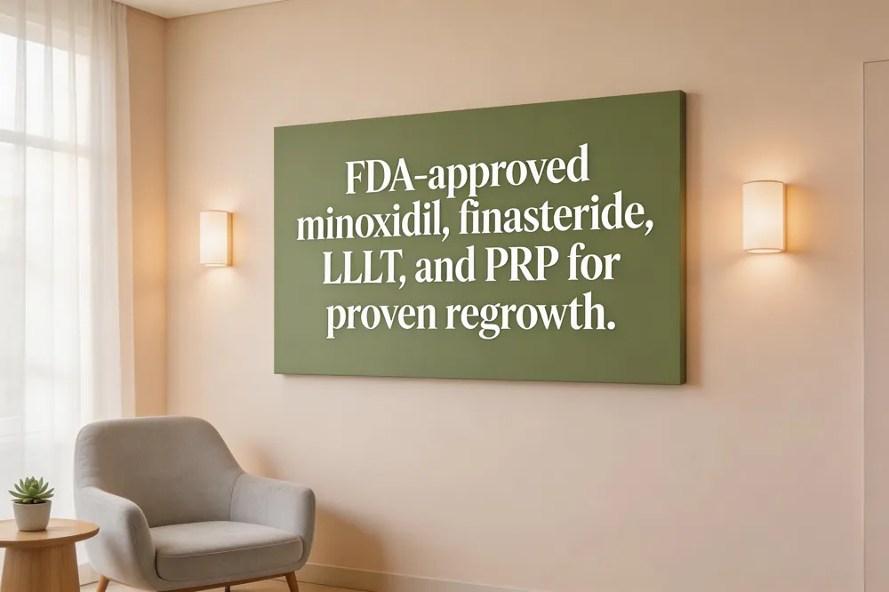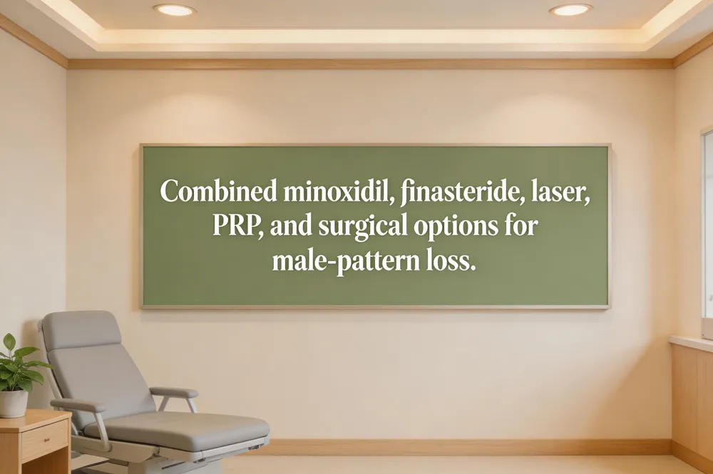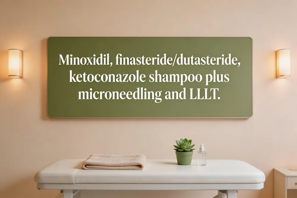 Best medical hair loss options incorporate minoxidil, finasteride/spironolactone, and adjunctive LLLT or PRP, all individualized to the patient’s pattern, gender, and underlying health.