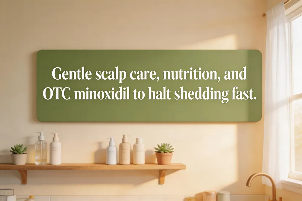 To curb shedding right away, switch to a gentle, sulfate‑free shampoo, avoid heat tools, tight hairstyles, and harsh chemicals. A brief scalp massage (11‑20 minutes daily) improves circulation, and applying over‑the‑counter minoxidil (2 % for women, 5 % for men) twice a day can stabilize loss while you arrange a dermatologist visit for pull tests, blood work, or scalp biopsy. In the meantime, eat a balanced diet rich in iron, protein, zinc, biotin, vitamin D, and omega‑3s, stay hydrated, and practice stress‑reduction techniques such as meditation or yoga.