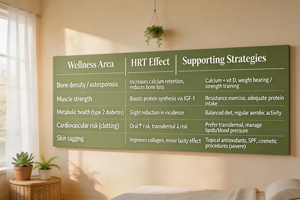 HRT eases hot flashes and improves bone density, cutting osteoporosis risk by up to 30 %. It helps preserve muscle strength through protein synthesis. Metabolic studies suggest a modest drop in type 2 diabetes incidence. For a natural route, bioidentical or plant‑derived phytoestrogens are options, though evidence is mixed and monitoring needed. Calcium, vitamin D, exercise, diet, and stress‑reduction enhance benefits and lower clot risk. Coordinated care with doctors and dermatologists provides bone scans, mammograms, and checks for safe treatment.
