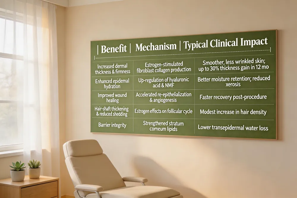 - Collagen and Elastin Restoration: Estrogen stimulates type I and III procollagen production, reducing wrinkle depth and enhancing firmness.