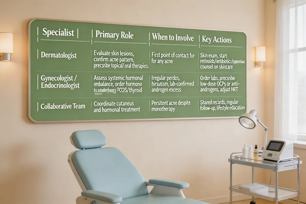 When to involve a gynecologist or endocrinologist – If acne is linked to systemic hormonal imbalance—evidenced by menstrual irregularities, hirsutism, or lab‑confirmed androgen excess—a gynecologist or endocrinologist should be consulted. They can order hormone panels, treat underlying conditions (PCOS, thyroid disorders), and adjust systemic hormone therapy, including low‑dose oral contraceptives or anti‑androgens.