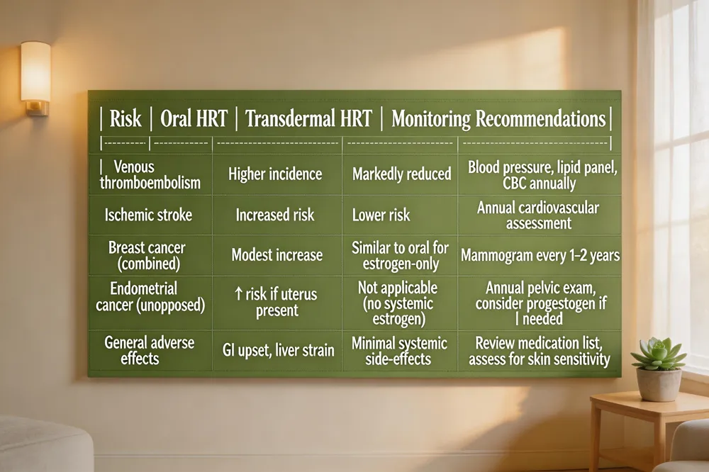 - Thromboembolic Events: Oral estrogen modestly raises clot risk; transdermal routes (patches, gels, sprays) have a markedly lower incidence and are preferred for women with clot concerns.