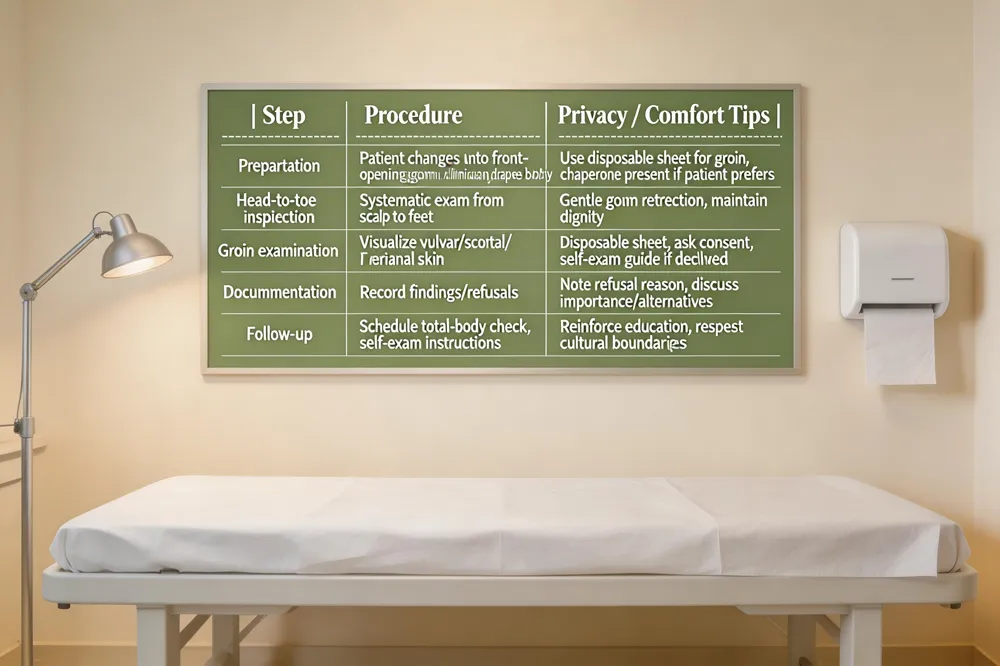Total‑body skin cancer screening recommends that clinicians inspect every skin surface, including the genital and perianal regions, because melanomas and keratinocyte cancers can arise in hidden sites. During a full‑body exam the patient is asked to change into a front‑opening medical gown; the clinician drapes the rest of the body, uses a disposable sheet for the groin, and may have a chaperone or nurse present for added privacy. The examination proceeds step‑by‑step from head to toe, with gentle retraction of the gown to visualize the vulvar, scrotal, and perianal skin, while maintaining dignity and comfort. If a patient declines the groin inspection, the provider documents the refusal, discusses the importance of complete screening, and offers alternatives such as targeted self‑examination instructions or referral to another dermatologist who can accommodate the patient’s preferences. Open communication ensures early detection of malignancy while respecting personal boundaries.