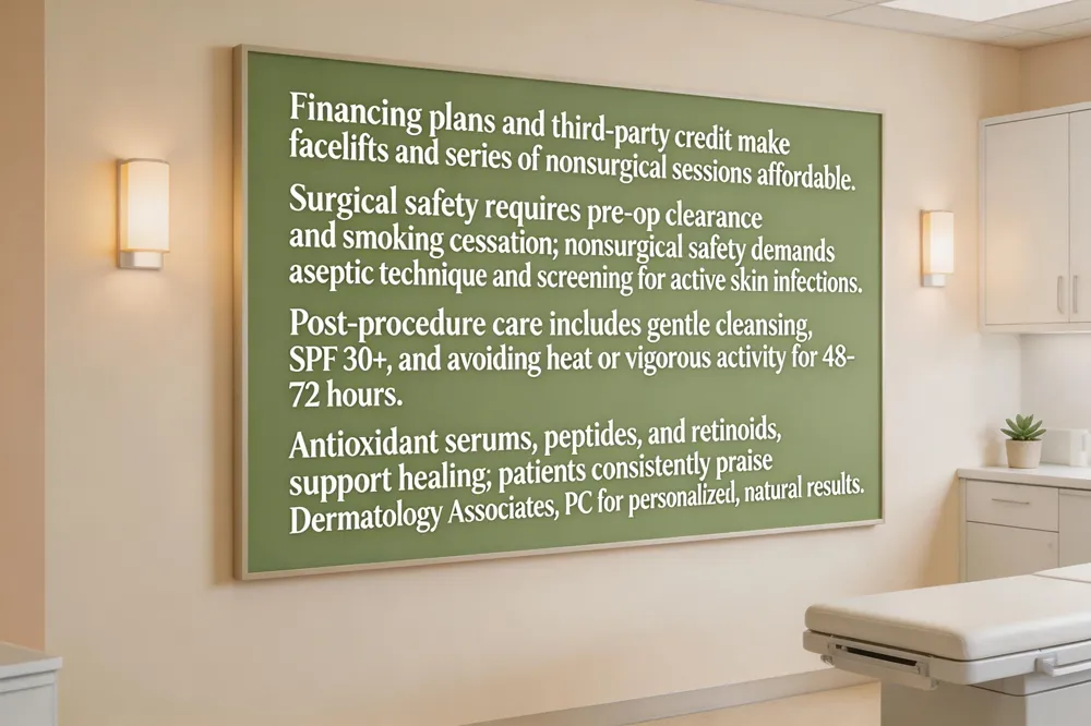 Financing and payment plans are essential for both surgical and nonsurgical rejuvenation. Many Indiana clinics, including Dermatology Associates, PC, offer flexible installment options and financing through third‑party providers, allowing patients to spread the cost of facelifts, laser resurfacing, or injectable series over time.