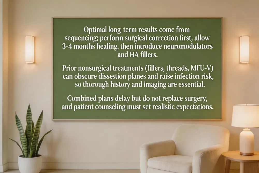 Sequencing surgery with injectable maintenance maximizes long‑term results. Most surgeons recommend performing a facelift or other anatomical correction first, allowing the tissues to heal for 3–4 months before introducing neuromodulators (e.g., Botox, Xeomin) and hyaluronic‑acid fillers. This timing lets the surgeon assess the new contour and prevents filler‑induced tension that could complicate scar placement or SMAS repositioning.