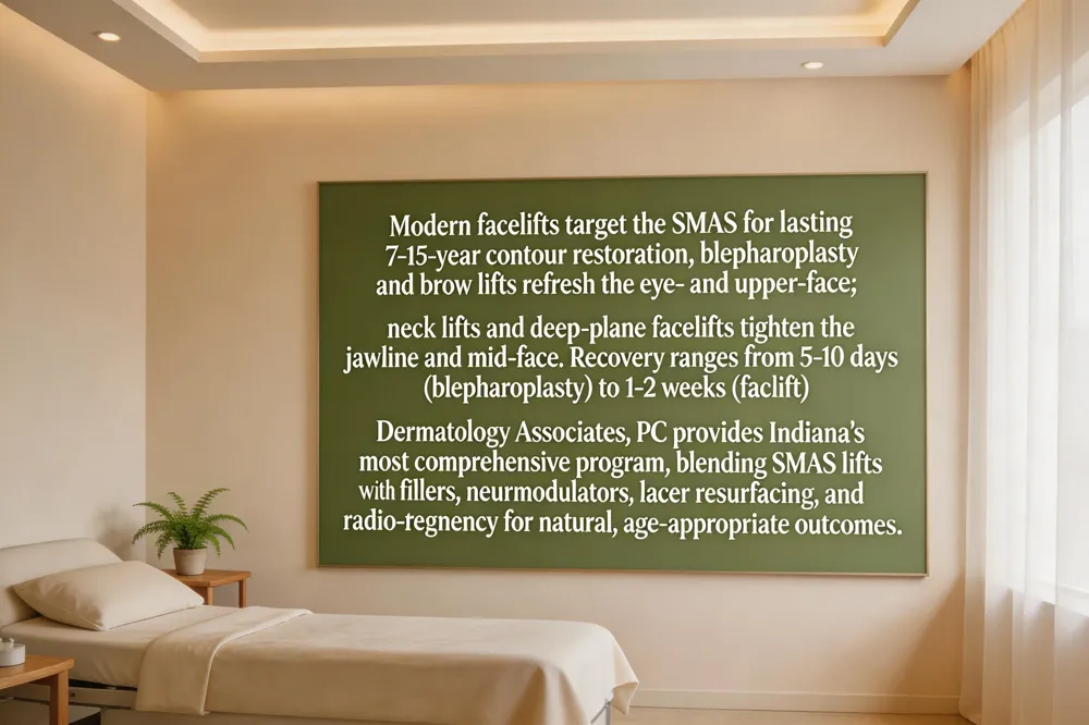 Best facial rejuvenation Indiana – Dermatology Associates, PC offers Indiana’s most comprehensive program, blending FDA‑approved Botox, Xeomin, Juvéderm, RHA, and Radiesse with laser resurfacing, radio‑frequency tightening, and SMAS facelifts for natural, age‑appropriate outcomes.