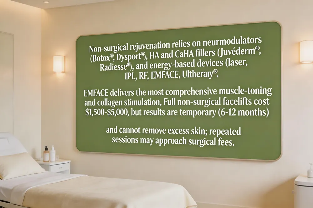Cost: A full non‑surgical facelift typically ranges $1,500–$5,000, often $2,500–$4,000 for combined ultrasound, fillers, and RF.