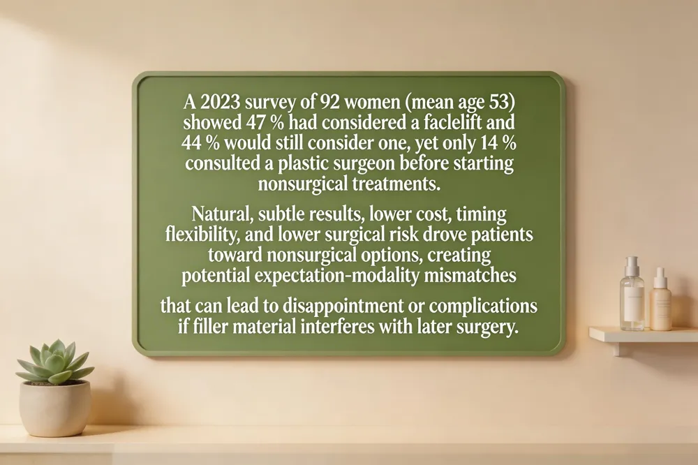A 2023 survey of 92 women (mean age 53) seeking total‑face nonsurgical rejuvenation revealed that 47 % had contemplated a facelift and 44 % would still consider one later, yet only 14 % had actually consulted a plastic surgeon before starting nonsurgical treatments. The most common motivations for choosing nonsurgical options were the desire for natural, subtle results; lower cost; flexibility in timing; concerns about surgical/anesthetic risks, downtime, scarring, and the ability to spread treatments over time. Because many patients decide on surgical versus nonsurgical pathways before professional advice, mismatches can arise between their expectations and the modality’s capabilities, potentially leading to disappointment or complications if residual filler material interferes with future surgery.