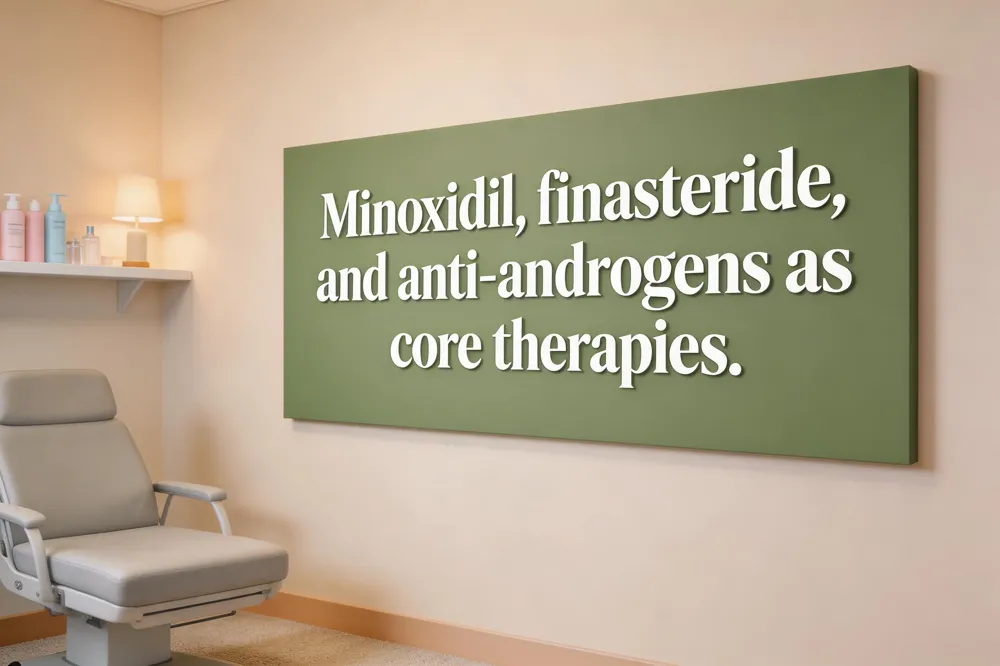 How do you treat hormonal hair loss? Treatment targets the underlying hormone: anti‑androgens (spironolactone, oral contraceptives) for women, finasteride for men, thyroid replacement or suppression as needed, and cortisol management through stress‑reduction. Topical minoxidil (2‑5%) is added to prolong anagen and stimulate new growth.