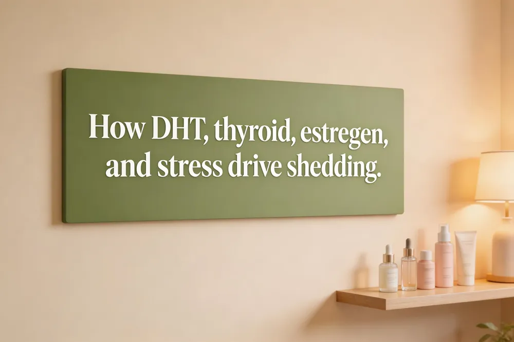 Androgenic alopecia results from genetic sensitivity to dihydrotestosterone (DHT) binding androgen receptors, causing miniaturization and progressive thinning. Thyroid disorders—both hypo‑ and hyperthyroidism disrupt the hair‑cycle, pushing follicles prematurely into telogen and producing diffuse shedding. Estrogen decline during menopause, postpartum, or after stopping hormonal contraception removes the protective anagen‑extending effect of estrogen, leading to noticeable thinning. Polycystic ovary syndrome (PCOS) and associated insulin resistance raise circulating androgens and DHT, accelerating pattern loss in women. Chronic emotional or physical stress elevates cortisol, which also forces follicles into telogen, manifesting as telogen effluvium.