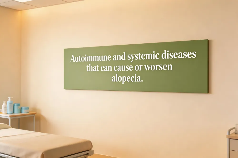 Lupus can produce scarring alopecia when immune‑mediated inflammation destroys follicles; treatment starts with a rheumatology‑dermatology work‑up and systemic agents such as corticosteroids, hydroxychloroquine, or other immunosuppressants to control disease activity. Topical or intralesional steroids, gentle hair‑care, and adjuncts like minoxidil or low‑level laser therapy may aid regrowth. Sjögren’s syndrome often presents as diffuse shedding; management includes topical, intralesional, and systemic corticosteroids, topical retinoids, oral isotretinoin, topical minoxidil, hydroxychloroquine, and finasteride to reduce inflammation and support follicle health. Alopecia areata causes sudden, patchy hair loss; first‑line therapy is intralesional corticosteroids, with options such as topical sensitizers, JAK inhibitors, or PRP for resistant cases. Thyroid disorders trigger telogen effluvium; correcting hypo‑ or hyper‑thyroidism with levothyroxine or antithyroid drugs normalizes the hair cycle and often restores density within months. Polycystic ovary syndrome raises androgen levels, promoting androgenetic thinning; anti‑androgen treatments (spironolactone, oral contraceptives), lifestyle changes, and minoxidil can mitigate progression.