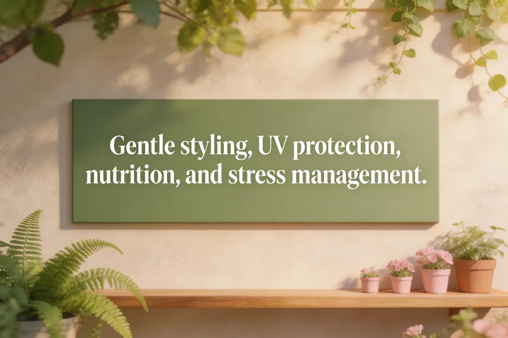 Gentle brushing with a wide‑toothed comb reduces mechanical trauma and prevents breakage that can mimic or worsen early thinning. Avoiding harsh chemicals (e.g., bleaching agents, relaxers), excessive heat styling, and tight hairstyles—such as braids, cornrows, or ponytails—protects follicles from traction alopecia and chemical‑induced damage. UV protection is essential; wearing hats or using scalp‑safe sunscreen shields hair shaft proteins and follicular DNA from radiation‑induced oxidative stress. Smoking cessation and minimizing exposure to air pollutants reduce vascular constriction, oxidative DNA injury, and inflammatory cytokine release that accelerate follicle miniaturization. Finally, a balanced diet rich in iron, vitamin D, zinc, protein, and essential fatty acids, combined with regular stress‑management techniques (e.g., mindfulness, exercise), supports the anagen phase and overall scalp health, helping to prevent both temporary shedding and permanent loss.