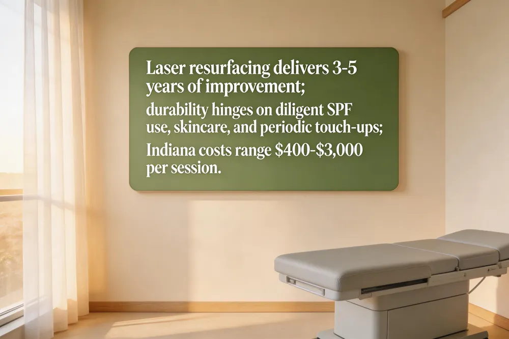 Cost considerations in Indiana In Indiana, laser resurfacing prices vary by technology and treatment area. Fractional CO₂ laser full‑face sessions range from $1,500 to $2,500, while smaller spot treatments start around $400–$800. Less aggressive options, such as Ultra Glo & Go or CoolPeel, are priced between $425 and $499 per session, with package discounts reducing per‑session costs to $300–$600. Overall, patients can expect a typical cost range of $400–$3,000 per treatment.
