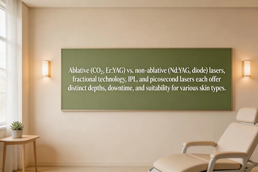 There are several core laser technologies used for facial rejuvenation and skin‑condition treatment. Ablative lasers such as CO₂ and Er:YAG remove the epidermis and heat the dermis, delivering deep resurfacing with dramatic results but requiring a recovery period. Non‑ablative lasers (e.g., Nd:YAG or diode) target deeper skin layers without breaking the surface, stimulating collagen and improving fine lines, pigmentation, and vascular concerns with minimal downtime. Fractional versions of both ablative and non‑ablative lasers create microscopic columns of treated tissue, combining the efficacy of resurfacing with faster healing and allowing customization for various skin types. Intense Pulsed Light (IPL) and picosecond lasers target pigment and vascular lesions, adding versatility to the practice’s toolkit for comprehensive facial skin care.