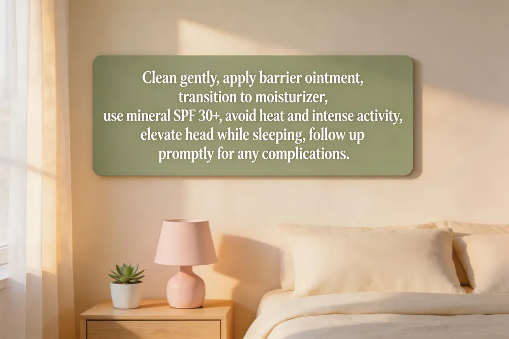 Sun protection strategies – Broad‑spectrum SPF 30+ mineral sunscreen (titanium‑dioxide or zinc‑oxide) should be applied every morning and re‑applied every two hours when outdoors. Wear a wide‑brim hat, sunglasses, and limit direct sun exposure for at least two weeks. Even on cloudy days, UV rays can trigger post‑inflammatory hyper‑ or hypopigmentation.