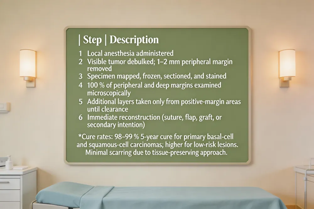 Local anesthesia and patient comfort – Only local anesthetic (usually lidocaine) is used, so you stay awake but feel no pain. The surgeon acts as pathologist and reconstructive specialist, allowing immediate margin assessment and same‑day wound closure.