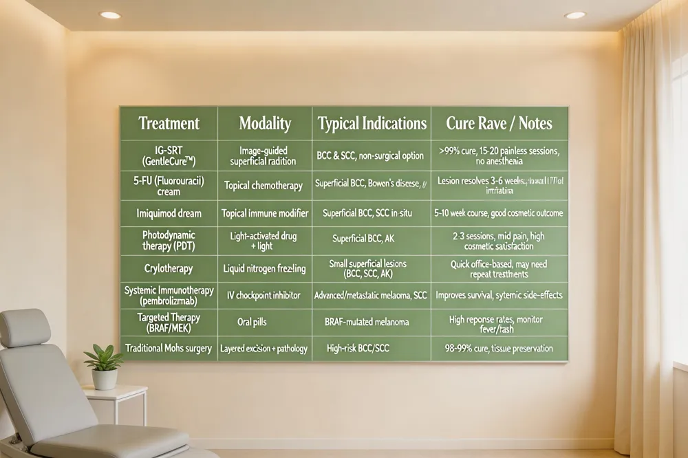 - Image‑Guided Superficial Radiation Therapy (IG‑SRT) – a precise, non‑invasive radiation option (GentleCure™) that rivals Mohs surgery in cure rates.