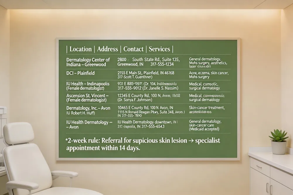 Medicaid‑accepting options include Dr. Anna Chacon, MD (listed on Zocdoc) and IU Health Dermatology downtown, both providing medical and surgical skin care. Verify coverage via the Indiana Medicaid Provider Directory.