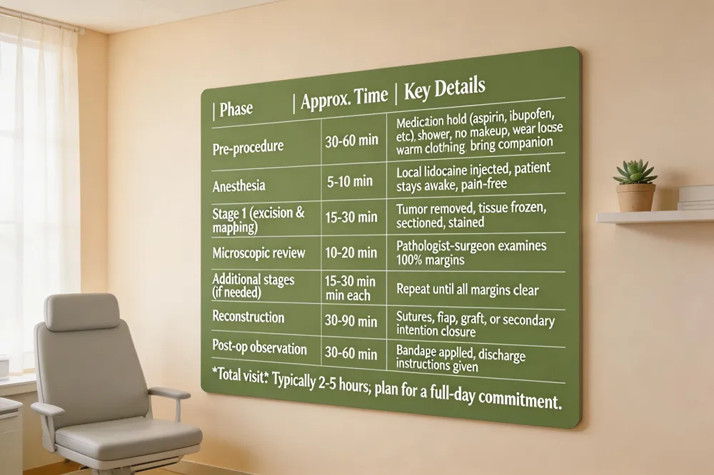 Typical duration and day‑long appointment – Mohs surgery is performed in stages; each thin tissue layer is frozen, sectioned, and examined (15‑30 min per layer). Most cases require 1‑3 stages, making the total visit 2‑5 hours, and patients should plan for a full‑day commitment.