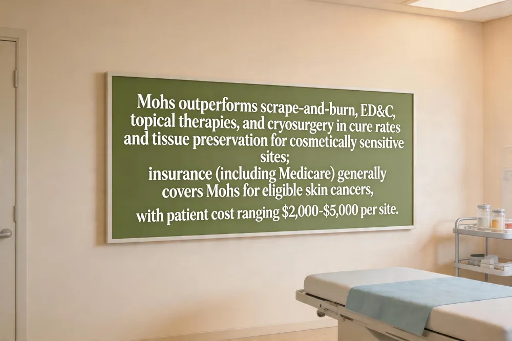 Mohs surgery vs. scrape‑and‑burn: Mohs surgery removes skin cancer layer by layer while examining each layer under a microscope in real time, achieving Mohs surgery has a cure rate of 97‑99% for basal cell and squamous cell carcinomas and The procedure spares the maximum amount of healthy tissue. Scrape‑and‑burn (electrodesiccation and curettage) is quicker and less costly but offers lower cure rates and less precise margin control, making Mohs the preferred choice for Mohs surgery is especially indicated for skin cancers located on cosmetically and functionally sensitive areas such as the face, neck, scalp, ears, fingers, and toes. New alternatives to Mohs include ED&C, topical immunotherapy (imiquimod), photodynamic therapy, cryosurgery, and radiation for non‑surgical candidates; selection hinges on tumor size, depth, location, and patient health. Traditional excision removes the visible tumor with a predetermined margin of normal skin (usually 4‑6 mm for basal cell carcinoma and 6‑10 mm for squamous cell carcinoma) and sends the specimen for pathology after the procedure. Mohs surgery cost typically ranges $2,000–$5,000 per site; In the United States, most insurance plans—including Medicare and many private insurers—cover Mohs surgery for eligible skin cancers, with patient responsibility limited to deductibles or copays. Our dermatology department treats skin cancer comprehensively—diagnosing, staging, and managing basal‑cell, squamous‑cell, and melanoma lesions with surgery, topical agents, and referral pathways such as the NHS “2‑week rule” for urgent evaluation.