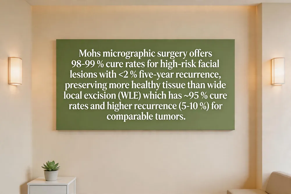 Cure rates Mohs achieves cure rates of 98‑99 % for high‑risk facial lesions and primary basal/squamous cell carcinomas, with recurrence <2 % at five years. WLE provides cure rates around 95 % for comparable tumors, with a slightly higher recurrence of 5‑10 % for high‑risk sites.