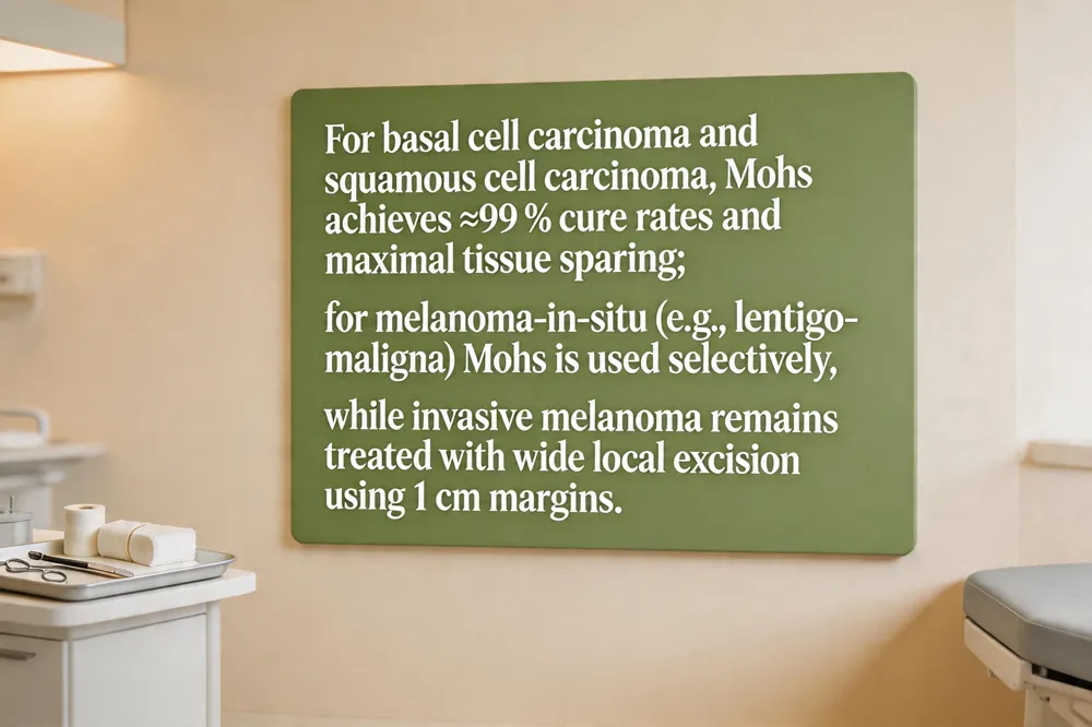 Mohs micrographic surgery removes skin cancer layer‑by‑layer with immediate microscopic examination, offering the highest cure rates (≈99 % for primary basal cell carcinoma (BCC) and squamous cell carcinoma (SCC)) and maximal tissue preservation. For melanoma, Mohs is reserved for select in‑situ lesions such as lentigo‑maligna; it uses 1‑2 mm margins and provides real‑time pathology, but wide local excision (WLE) with guideline‑based 1 cm margins remains the standard for invasive melanoma due to extensive outcome data. In BCC, Mohs achieves near‑perfect clearance while sparing healthy skin, making it the preferred option for facial, ear, hand, or other cosmetically critical sites; traditional excision employs a 4‑mm margin and may leave larger scars. For SCC, Mohs offers comparable cure rates to excision (≈99 % vs ≈95 %) but excels in high‑risk or recurrent tumors and in functionally sensitive areas, thanks to its 1‑2 mm staged removal and 100 % margin assessment. On the face, Mohs is the gold‑standard, delivering ≈99 % cure rates, minimal scarring, and immediate reconstruction in a single outpatient visit. Dermatologists assess tumor type, size, location, and patient priorities to select the most appropriate surgical approach.