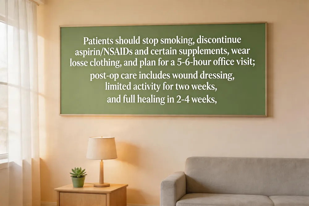 Before surgery, wear warm, loose clothing, shower and avoid makeup on the site, and bring a snack or reading material. Stop smoking at least two weeks prior and discontinue aspirin, ibuprofen, herbal supplements (garlic, ginkgo, fish oil) and alcohol a week before to reduce bleeding. Eat a normal breakfast on the day of surgery, arrange transportation, and be prepared for a 5‑6‑hour office visit while the surgeon removes tissue layer‑by‑layer and examines it under a microscope.