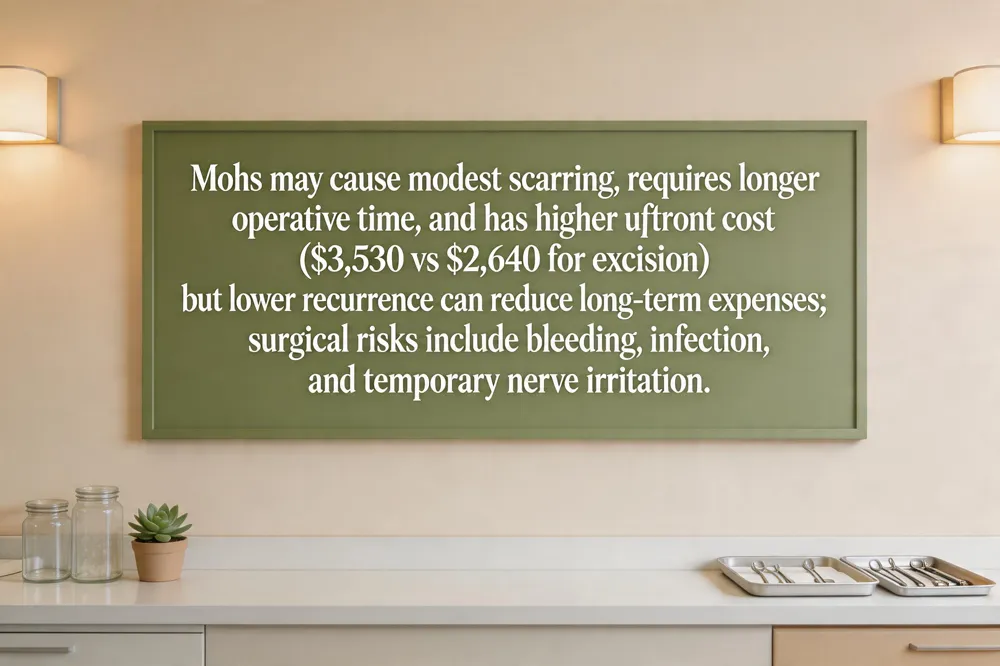 What are the negatives of Mohs surgery? The main negatives are a modest scar, longer operative time, and a small risk of infection or nerve irritation, plus higher upfront costs.