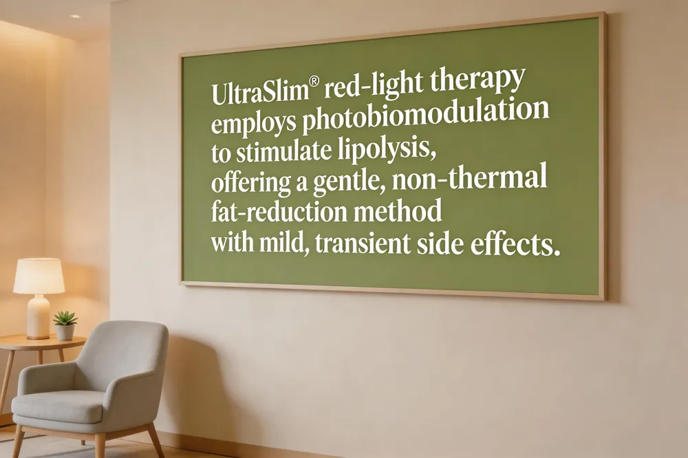 UltraSlim® red‑light therapy is the latest FDA‑cleared non‑invasive fat‑removal system. It delivers narrow‑band red and near‑infrared wavelengths (typically 630‑660 nm and 810‑850 nm) that penetrate the dermis, trigger photobiomodulation, and promote lipolysis by increasing mitochondrial activity and micro‑circulation. Low‑level light therapy (LLLT) works on the same principle of photobiomodulation without heating tissue; low‑intensity visible light creates transient pores in adipocyte membranes, allowing intracellular lipids to be released and metabolized. The FDA cleared UltraSlim® in recent years, classifying it as a safe, non‑thermal device for cosmetic body contouring. Reported adverse events are mild—temporary redness, tingling, or mild pigment change—and serious complications such as burns or nerve injury have not been observed. A typical regimen consists of three to five 30‑minute sessions spaced one to two weeks apart, with measurable circumference reductions appearing within hours and continuing to improve over the subsequent weeks. Patients generally experience no downtime and can resume normal activities immediately after each treatment. Answering the key question: the newest non‑invasive fat‑removal technology is Red Light Therapy, marketed as UltraSlim®, which uses specific red‑light wavelengths to safely and gradually shrink sub‑cutaneous fat cells.