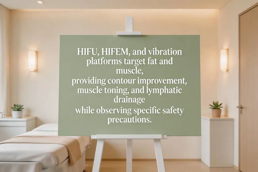 High‑intensity focused ultrasound (HIFU) for body contouring delivers tightly focused acoustic waves that raise adipose tissue temperature above 56 °C, causing coagulative necrosis and acoustic cavitation of fat cells while sparing skin. Clinical studies report waist circumference reductions of 2–4.6 cm after 1–3 sessions, with most adverse events limited to transient pain, edema, or mild bruising. Pulsed magnetic‑field devices, exemplified by Emsculpt Neo, combine high‑intensity focused electromagnetic (HIFEM) muscle contractions with radiofrequency heating; the supramaximal contractions increase muscle thickness by ~19 % and reduce subcutaneous fat by up to 30 % after six 30‑minute sessions. Mechanical massage or vibration platforms act as lymphatic drainage systems, enhancing fluid removal and temporarily smoothing cellulite; patients may feel mild discomfort or bruising, especially those with pressure urticaria. Safety considerations across all three modalities include contraindications for active implants (pacemakers, defibrillators), metal under the skin, pregnancy, and photosensitivity disorders. Proper device cleaning, use of disposable components, and thorough pre‑treatment medical history review are essential to prevent infection and rare complications such as nerve injury or paradoxical adipose hyperplasia.