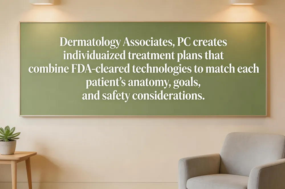 Dermatology Associates, PC begins every non‑invasive body‑contouring journey with a comprehensive consultation that documents medical history, medications, implants, tattoos, and skin type. This assessment informs an individualized treatment plan that may combine FDA‑cleared technologies—cryolipolysis, radiofrequency, laser‑based energy, therapeutic ultrasound, low‑level light therapy, pulsed magnetic fields, or mechanical massage to maximize fat reduction, skin tightening, and muscle tone while respecting each patient’s contraindications (e.g., pacemakers, Raynaud’s disease, active infections).