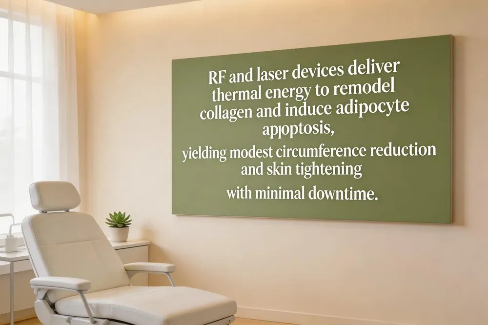Radiofrequency (RF) devices (FDA product code GEI) deliver controlled thermal energy to the dermis and subcutaneous fat. The heat denatures collagen fibers, stimulates neocollagenesis, and induces adipocyte apoptosis, resulting in modest circumference reduction and skin tightening.