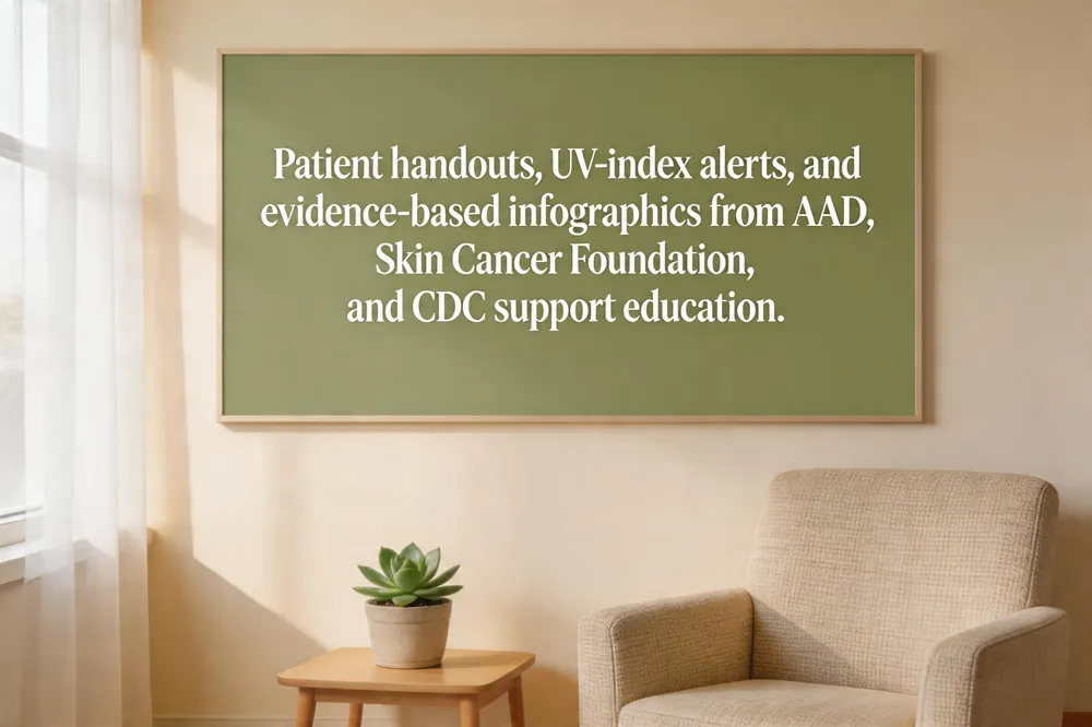 Patient education tools: Dermatology Associates, PC offers printable handouts, videos, and an interactive UV‑index app that alerts patients when the forecast exceeds 3. UV index usage: The UV Index, posted daily by the National Weather Service, predicts when UV radiation is strong; a value of 3 or higher triggers protective actions, especially between 10 a.m. and 4 p.m. Fact‑based infographics: Free, peer‑reviewed graphics are available from the American Academy of Dermatology, the Skin Cancer Foundation, and the CDC’s “Sun Safety Facts” sheet, covering sunscreen application, shade‑seeking, and hat use.