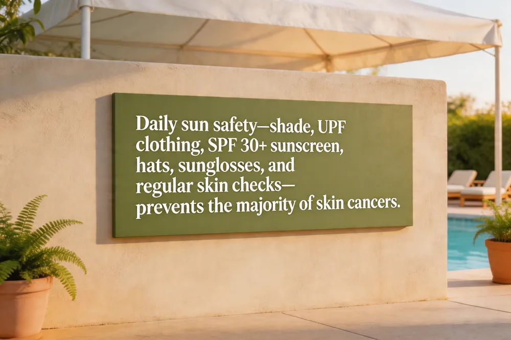 Is skin cancer preventable? Yes. Most skin cancers arise from UV exposure and can be avoided by daily sun‑safety habits: seek shade when the UV Index ≥ 3, wear tightly‑woven clothing, a wide‑brimmed hat, UV‑blocking sunglasses, and apply broad‑spectrum sunscreen (SPF 30 or higher). Avoid indoor tanning and limit outdoor time between 10 a.m.–4 p.m. Routine self‑exams and annual dermatologist visits catch lesions early.