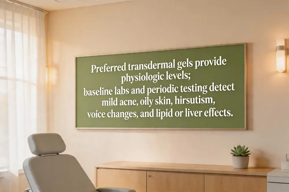 Transdermal gels or creams are the preferred testosterone delivery method for women because they provide steady, physiologic serum levels while avoiding first‑pass liver metabolism and the dose spikes seen with oral or injectable forms. A typical regimen uses a 2 % gel (≈5 mg daily) applied to clean, dry skin on the lower abdomen or thigh; the site should be covered and hands washed to prevent transfer. Baseline labs—total and free testosterone, estradiol, SHBG, lipid panel, liver enzymes, and a complete blood count—are obtained before starting therapy, with follow‑up testing at 4–6 weeks and then every 3–6 months to keep levels within the female reference range (20‑50 ng/dL). Low‑dose testosterone most commonly causes mild acne, oily skin, and modest hirsutism; less frequent effects include voice deepening, clitoral enlargement, menstrual irregularities, and subtle lipid or liver‑enzyme changes. Any new skin, hair, or menstrual symptoms should prompt a dose review and possible referral to a dermatologist.