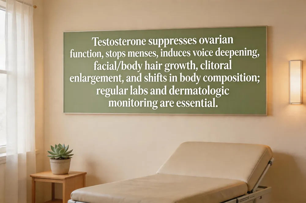 Physiologic changes – Testosterone suppresses ovarian estrogen production, leading to cessation of menses and gradual breast atrophy. Within months, patients develop voice deepening, increased facial and body hair, clitoral enlargement, redistribution of body fat to an android pattern, and gains in muscle mass and bone density. Blood chemistry shifts may include higher LDL, lower HDL, elevated hemoglobin/hematocrit, and a modest rise in cardiovascular risk if not monitored.