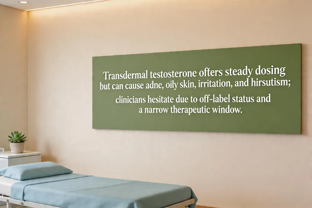 Why clinicians may be reluctant to prescribe – Testosterone is not FDA‑approved for women; off‑label use demands careful baseline labs, regular monitoring, and informed consent. The therapeutic window is narrow, and excess levels increase the risk of acne, hirsutism, cardiovascular events, liver enzyme elevations, and potential stimulation of hormone‑sensitive cancers. Limited long‑term safety data and the need for specialist oversight make many physicians prefer alternative treatments unless a clear indication such as hypoactive sexual desire disorder exists.