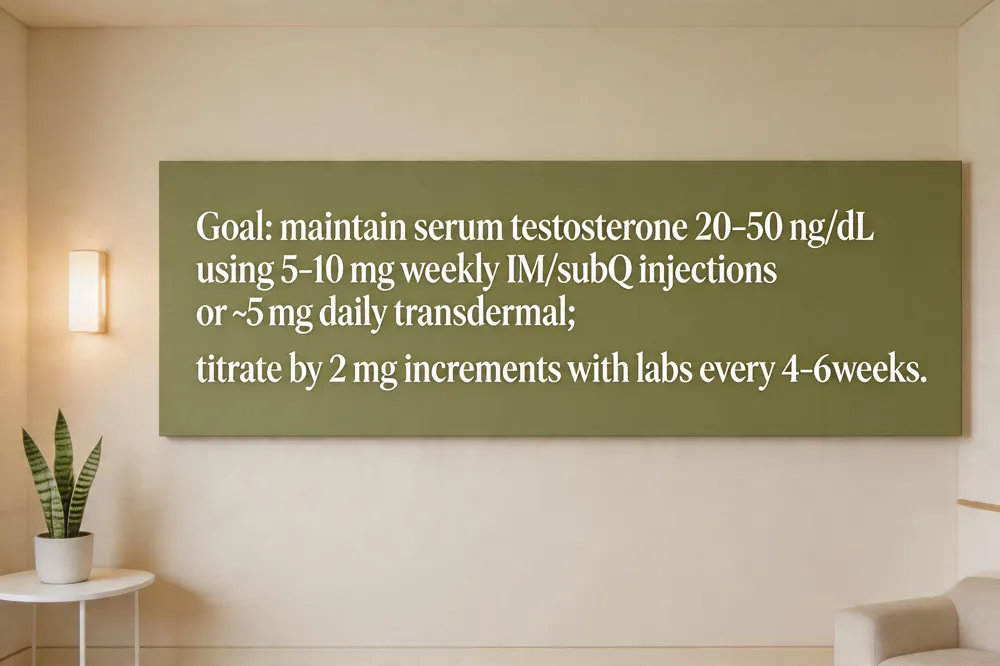 Injection dosing strategies: Initiate with 5‑10 mg of testosterone administered once weekly, either intramuscularly or subcutaneously. Doses may be split into two smaller injections if preferred. Follow a “start low, go slow” protocol, adjusting by 2‑mg increments only after reviewing serum levels and clinical response (libido, mood, energy, skin changes).