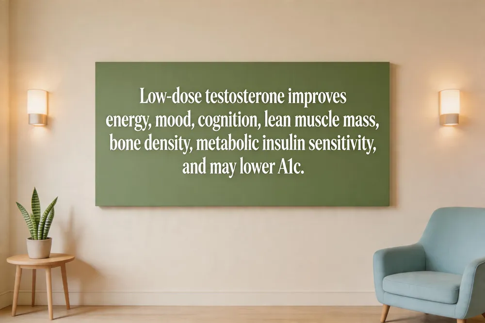 Metabolic impact and A1c – Low testosterone is linked to insulin resistance and higher visceral fat, which can elevate hemoglobin A1c. Restoring normal levels improves insulin sensitivity, may lower fasting glucose, and help maintain healthier A1c values.
