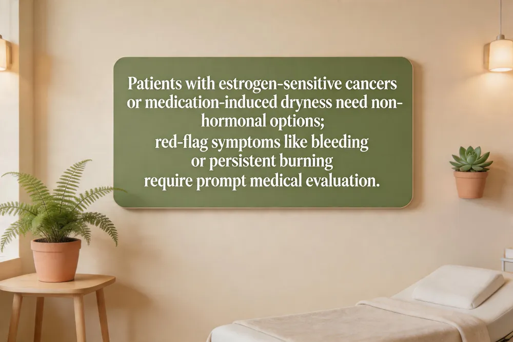 Women with a history of estrogen‑dependent breast cancer, endometrial cancer, or unexplained vaginal bleeding should avoid estrogen‑containing products unless cleared by their oncologist. Non‑hormonal moisturizers (e.g., hyaluronic‑acid gels) and water‑based lubricants are first‑line options. If symptoms persist, a low‑dose vaginal estrogen may be considered only after specialist consultation and risk‑benefit analysis.