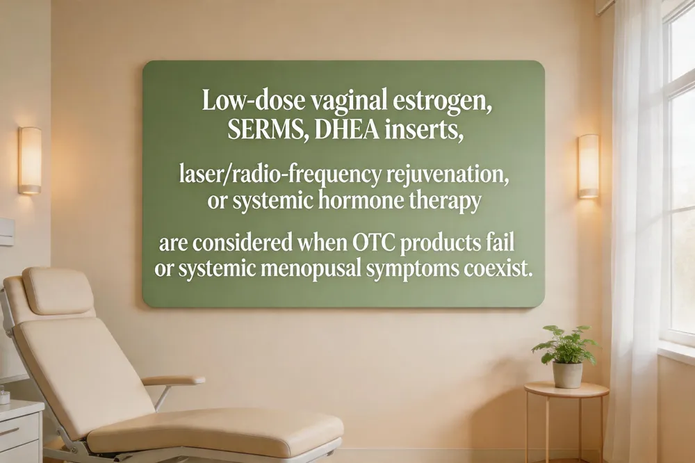 For women whose vaginal dryness persists despite regular use of moisturizers and lubricants, prescription therapies provide stronger, longer‑lasting relief. Low‑dose vaginal estrogen—available as creams, tablets (e.g., Vagifem® estradiol inserts or or rings) delivers estradiol directly to the mucosa, thickening the epithelium, restoring pH, and improving natural lubrication with minimal systemic absorption. Selective estrogen‑receptor modulators (SERMs) such as oral ospemifene act like estrogen in vaginal tissue while antagonizing it elsewhere, reducing dyspareunia without the need for local hormone application. DHEA inserts (prasterone) are converted in vaginal cells to estrogen and testosterone, offering another non‑systemic option for moderate‑to‑severe atrophy. For patients who prefer non‑hormonal approaches, laser or radio‑frequency vaginal rejuvenation stimulates collagen remodeling and tissue elasticity, though long‑term safety data remain limited. When genital symptoms coexist with systemic menopausal complaints (hot flashes, mood changes), systemic hormone therapy—transdermal patches, gels, or oral preparations may be considered after a thorough risk‑benefit assessment. All prescription options should be initiated under clinician supervision, with attention to contraindications such as estrogen‑sensitive cancers, unexplained bleeding, or thromboembolic risk.