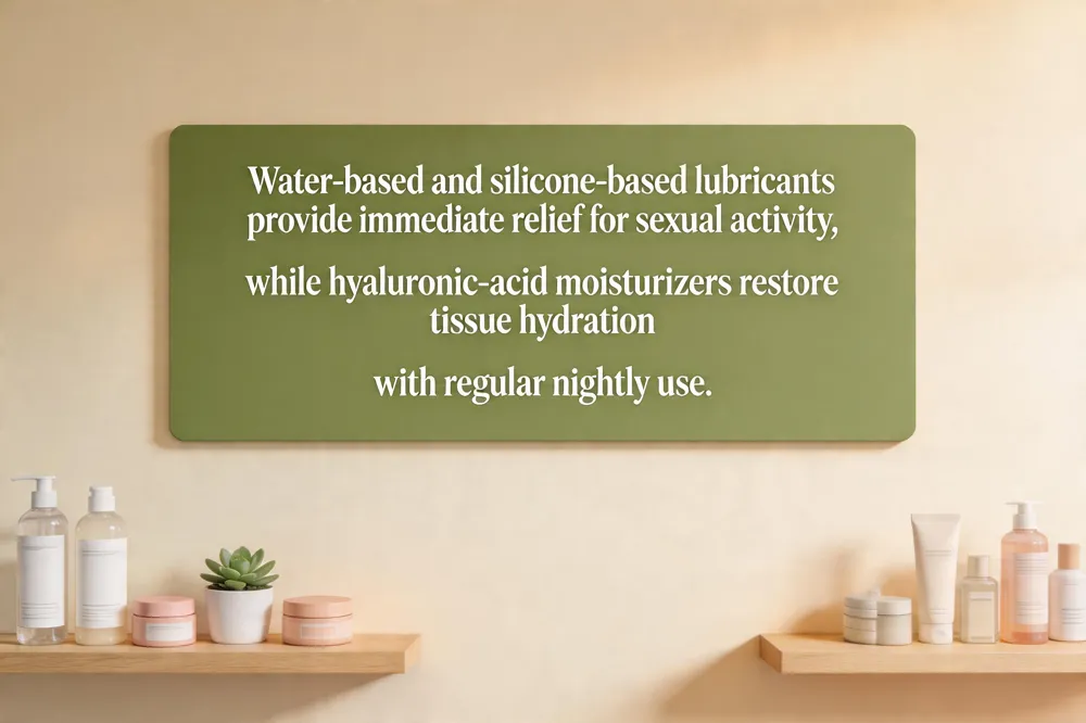 Vaginal dryness is most often due to reduced estrogen levels, leading to thin, less elastic mucosa. First‑line non‑hormonal care includes water‑based lubricants (e.g., Astroglide, K‑Y Jelly) that are latex‑condom compatible, easy to clean, and need re‑application during longer sessions. Silicone‑based lubricants (e.g., Überlube, Swiss Navy Premium) last longer, provide a smoother glide, and are also condom‑safe, though they should not be used with silicone toys. Hyaluronic‑acid moisturizers (e.g., Revivee, CVS Hyaluronic‑acid gel) are applied internally 2–3 times per week; they absorb into the tissue, restoring hydration and elasticity over time. For optimal benefit, moisturizers are used nightly or every few days, while lubricants are applied just before sexual activity. Product safety with condoms is essential: water‑based and silicone‑based lubricants do not degrade latex, whereas oil‑based products should be avoided.